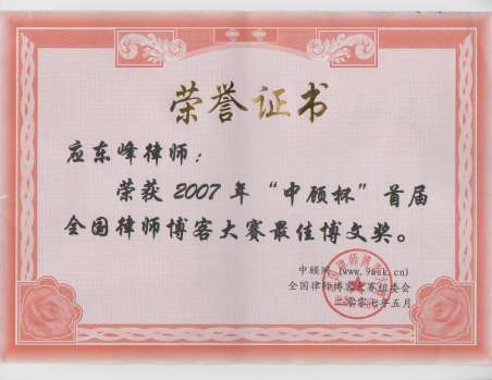 應東峰律師獲首屆全國律師博客大賽最佳博客作品獎