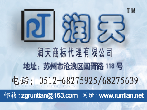 蘇州潤天商標事務所0512-68275925是國家商標局在蘇州地區專業從事商標注冊申請、續展、轉讓、商標監測、知識產權訴訟、蘇州軟件著作權登記\蘇州版權登記代理等知識產權服務的專門機構。條形碼登記代理|蘇州商標申請|蘇州商標代理|昆山商標代理|蘇州商標|蘇州商標注冊|蘇州商標|知識產權訴訟代理|蘇州商標注冊公司|吳江商標注冊公司|太倉商標注冊|太倉商標注冊申請|太倉商標注冊公司|昆山商標注冊公司|吳江商標注冊公司|商標轉讓申請|商標續展申請|商標設計|蘇州LOGO設計|商標查詢|商標免費查詢|蘇州工業園區商標注冊|蘇州新區商標注冊蘇州商標公司|蘇州商標注冊|蘇州商標代理公司|蘇州商標事務所|蘇州商標注冊公司|蘇州商標設計|蘇州商標代理|蘇州商標網|蘇州商標注冊事務所|蘇州商標注冊流程|蘇州潤天商標代理有限公司0512-68275925|0512-68275639聯系電話:13812645181|聯系人:康秀|網址:WWW.RUNTIAN.NET